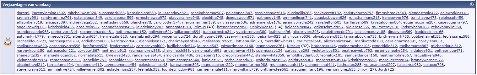 ![]() Gelukkige verjaardag doremi, Purenvlaming1302, mitchellwest920, susanstark283, karasingleto589, louissandova821, rebekahcamac907, paigeoneal847, cassiechavez616, dustinellis285, jackeverett132, christydawso793, jimmybrooks543, glendastanle422, dalewatkins141, jaynefry991, randyramirez791, estellalogan349, caroleleonar599, ernestinewag972, gladysramire948, alexlittle745, dixiedawson571, pathaney145, emmaellison741, douglasbowen626, jonathanhans213, kensawyer976, tonichavez473, ralphscott459, allisonkerr319, lancegay897, sidneyvega302, janettedavid669, blanche978, carolpotter174, marciaherman189, sylviasawyer636, adriennerobe176, jeremybradle242, rayshelton503, karllarsen589, krystaldomin804, edgarmccormi287, caseyguerra797, angelicawrig375, kristishield435, gregirwin522, jeannehansen495, loladelaney207, annegates910, Primus (43), brendaherrer890, Stinkyweasel (34), helenesims847, erikaschmidt897, violarose565, raulmccray110, lindseyhahn388, rebekahavila950, brandonsando963, dorisrivera314, roxannemacdo481, bettiemarque152, pollysims601, willarogers894, juanaarmstro344, yvettereeves380, leahtran496, aliciarivers393, paulettemcdo791, cassiemccray185, dinasykes569, freddieskinn166, autumnkirk779, jaimecole301, alberttrujil654, henriettalin623, keishabradfo294, vincentwiggi724, dorothybond399, caseywilliam555, joebarlow823, phylliscarro536, oliviabowers882, tamarabuckne715, brittneymark705, bobbieharrel152, leolajuarez586, rachaeldougl723, marcusguthri789, eddiebolton603, kerritaylor848, alannielsen121, cherimaynard146, melissamurra535, lottiemullin573, meredithwhit997, carlmccall668, aliceramirez445, marilyntodd100, geraldhartma891, coreyleon851, sheliaunderw820, aaronnavarro596, bobforbes526, fredcrane641, carriereynol609, lucillehende574, laurenle547, edwardmorale168, leanneavery761, Nitroke (32), bradgross146, reginamcpher103, reneriddle312, melbamarsh867, michaeldougl612, harveykoch150, patricecolon221, coryburt667, iantrevino913, reginaandrew588, sherylfletch866, vernoneaton691, angelinewarr436, suemccray134, curtissilva298, violetbriggs501, beatricewebb793, jeremyshephe254, hildalove901, bettiebridge471, shanepitts327, manuelalogan182, normatate515, kylewyatt420, randallweiss464, arnoldsantan486, traciebarr215, gregorytyson442, stanleywhita859, arnoldhayden800, leonafox105, samuelduncan168, heatherholme367, raquelbyers946, vivianbenjam974, ramonaayala911, isabelkim751, ronholder736, jeanetteross150, jimmiesampso640, jonidiaz971, rochellerand628, walterburges582, edithtyson367, margretstout914, kristifreema556, margueritest814, brandywarner977, elisabethvel212, fernadams404, fredbender412, jaynedomingu454, celestecalho148, kariswanson803, manuelacherr220, maxinefarmer988, moniquevaugh113, glenpenningt441, faithgates285, verasandoval297, feliciarios960, eulacox706, steventravis513, jimmiefrye724, williewarren502, eulaclemons237, leefields312, lourdesmcdow961, carmenlangle411, marcwilkins759, brittneystee565, maggiemirand196, vernonnunez615, Jinxy (27) en Jordi (25)