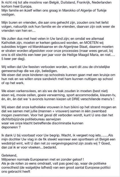 Peumans (pro islamitische hoofddoek in het parlement): "..mensen komen niet voor niets naar ons land. Het is een rijke regio, het is hier goed. Men zou het beter vanuit die positievere optiek belichten" Fout Peumans (pro islamitische hoofddoek in het parlement) die mensen komen naar hier omdat wij gulle gevers zijn in een arm met torenhoge schulden (vandaar dat we moeten besparen) en werkloosheid beladen land. Peumans wil duidelijk niet dat het hier goed blijft, hij is blij met onze reputatie in het verre moslimbuitenland zodat er nog meer naar hier mogen komen om onze samenleving te 'verrijken' met hun aanwezigheid. Niet Bart De Wever doch Peumans zou beter zwijgen. http://www.hln.be/hln/nl/34662/Vluch...-zwijgen.dhtml