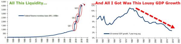 De eruit getrokken conclusies, niet. Een centrale bank kan 99999987654321 euro's bijmaken op haar balansen. Het is gewoon computergewijs editeren van getalletjes op die balansen. Als die balansen niet worden aangesproken, dan wordt er niks meer gekocht in de economie. Een centrale bank kan 99999987654321 euro's bijmaken als bankbriefjes. Het is gewoon voldoende nulletjes en voldoende aantal papier en inkt. Creatie is echter niet gebruiken. En het werd niet gebruikt. Omdat de centrale bank haar lidbanken meer betaalde om het niet uit te lenen, dan de rente die de lidbanken zouden hebben gehad van degenen aan wie ze zouden uitlenen. Zero Intrest Policy, is Zero, maar Zero is geen einder, ga gewoon negatief. En dat is wat de centrale bank deed. Zerohedge haalt inkomsten uit sukkels die geloven wat er op hun blog verschijnt, EN de gesuggereerde acties ondernemen. Zij verkopen de producten waarvan ze suggereren dat die koopkracht gaan "beschermen". Sukkels die door de valse verhaaltjes bereidwillig gemaakt werden om hogere prijzen ervoor te betalen. Er was niks "radicaals" aan QE1 tot en met 3. De olieprijs werd net als sommige andere opgedreven door valse verwachtingen. De olieprijs werd net als sommige andere omlaaggedreven door bijgestelde verwachtingen. Met de futures markt als extra schep op die prijzen. De algemene prijzentrend echter, wijzigde veel minder dan de QE's suggereerden. Nogal logisch, als het geld ervan eigenlijk gewoon werd gemaakt en vernietigd in een steriele wereld (een harde schijf van een computer bij een centrale bank). En dat is ook wat de "netto" monetaire basis toont. Een verderzetting, van dezelfde lijn / helling als voorheen 2008. Al een dozijn keer gezegd en bronnen gegeven, en u blijft maar vertoeven in de wereld van nepverhaaltjes van Zerohedge en consoorten. Waarom? Heeft u een activiteit die profijt haalt op dezelfde basis?