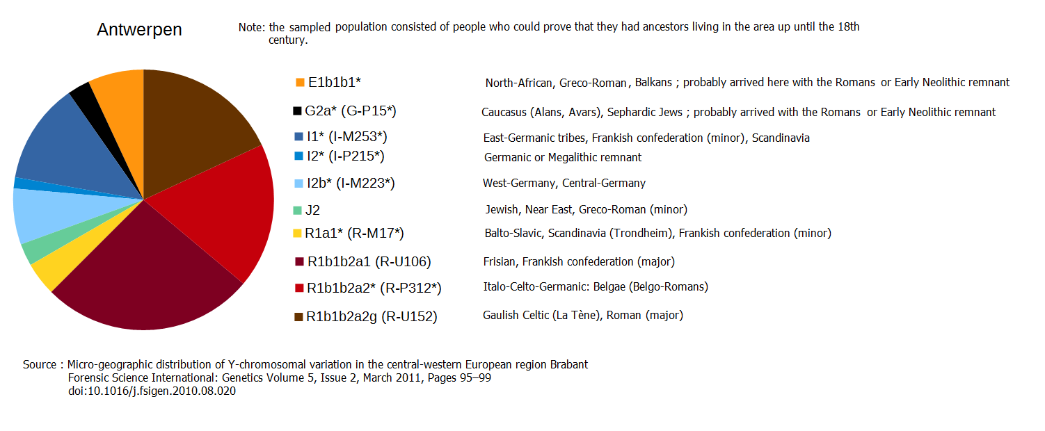Het is al een aantal jaar geleden sinds ik nog eens hier iets geplaatst heb. Ik herinner me nog laaiende discussies en vergaande speculaties over de origines van het Vlaamse volk. Germaans, Keltisch, Vikingen, Ingvaeoonse Friezen enz... Zoals altijd ligt de waarheid ergens in het midden. Op eupedia.com was men al een tijdje bezig de Y-DNA haplogroepen van de Benelux in kaart aan het brengen. Nu heb ik in mijn handen een studie: Micro-geographic distribution of Y-chromosomal variation in the central-western European region Brabant die een grote populatie uit het voormalige hertogdom Brabant gepolst heeft, en enkel diegene die hun afkomst in de regio kunnen staven tot in de 18de eeuw. Het gebied omvat dus Noord-Brabant (NL), de Kempen, Antwerpen, Mechelen, Vlaams- en Waals-Brabant. Nu, sommigen vragen zich misschien af wat haplogroepen zijn: Citaat: