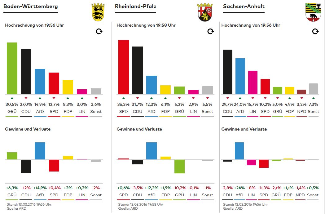 Ik weet niet of je de Wapper zijn grafieken goed bekeken hebt maar enkel in Baden-Württemberg gaan de Groenen er 6,3% op vooruit. Voor de rest blijven de linkse partijen op een vergelijkbaar percentage, ofwel krijgen ze een pandoering van jewelste.
