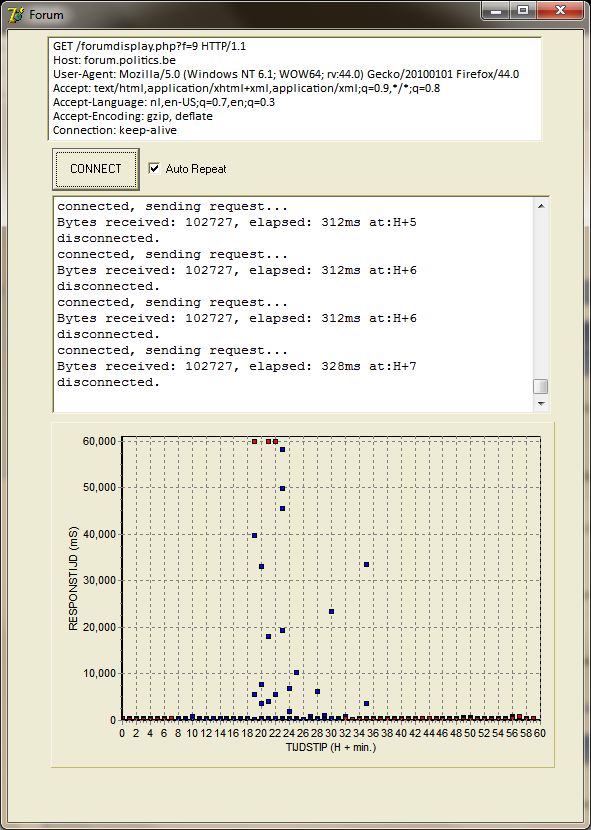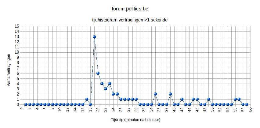 Het viel me al lang op dat het fenomeen niet random optreedt maar op bepaalde momenten, op het eerste zicht ruwweg in de periode van 18..25 minuten na het uur. Om dat te onderzoeken schreef ik een eenvoudige applikatie die elke 30 sekonden een connectie maakt met het forum, het subforum K&K opvraagt, en de tijd meet tussen het verzenden van het HTTP-request en het ontvangen van de laatste lijn van deze pagina. Indien na 1 minuut geen antwoord wordt ontvangen dan telt de applikatie uit, en noteert 60.000 als meetwaarde. De applikatie heeft totnogtoe 18,5 uur continue gelopen, en 2200+ meetresultaten verzameld. De resultaten worden gepresenteerd met de tijd modulo 60 minuten op de x-as, en de vastgestelde responstijden (in millisekonden) op de y-as. Op deze wijze wordt de "tijdsfilm" opgedeeld in blokken van 1 uur die a.h.w. over mekaar geprojecteerd worden, en zou eventuele systematiek aan het licht moeten komen Tijdens de 18-urige observatieperiode werden 9 volledige timeouts geteld, en een rist "gewone" vertragingen gaande van enkele tot 58 seconden. In de periode van 0..18 minuten trad het fenomeen nooit op, dan vanaf 18..23 min. is er een plotse piek, dan wordt het vertragingspatroon langzaam minder dens. Door de meetdata als tijdhistogram te presenteren wordt het patroon nog veel duidelijker. Op de y-as worden nu - voor elke periode van 1 minuut - het aantal keren geteld waar de responstijd groter was dan 10 seconden in die bepaalde minuut na het uur. (de grafiekhoofding vermeldt verkeerdelijk > 1 seconde) Het is zonneklaar dat er op H+19 "iets" gebeurt dat de werking van het forum verstoort, na ~10 minuten langzaam quasi uitdooft, waarna alleen nog sporadische problemen optreden. QED: Het fenomeen treedt niet random op, maar systematisch. Ik geen flauw idee of de oorzaak te zoeken valt in de vBulletin software zelf, of algemeen in de server die (vermoed ik) niet dedicated is maar gedeeld wordt met mogelijk vele andere gebruikers. Ik tip op het laatste: misschien kan OVH hier uitsluitsel geven? |