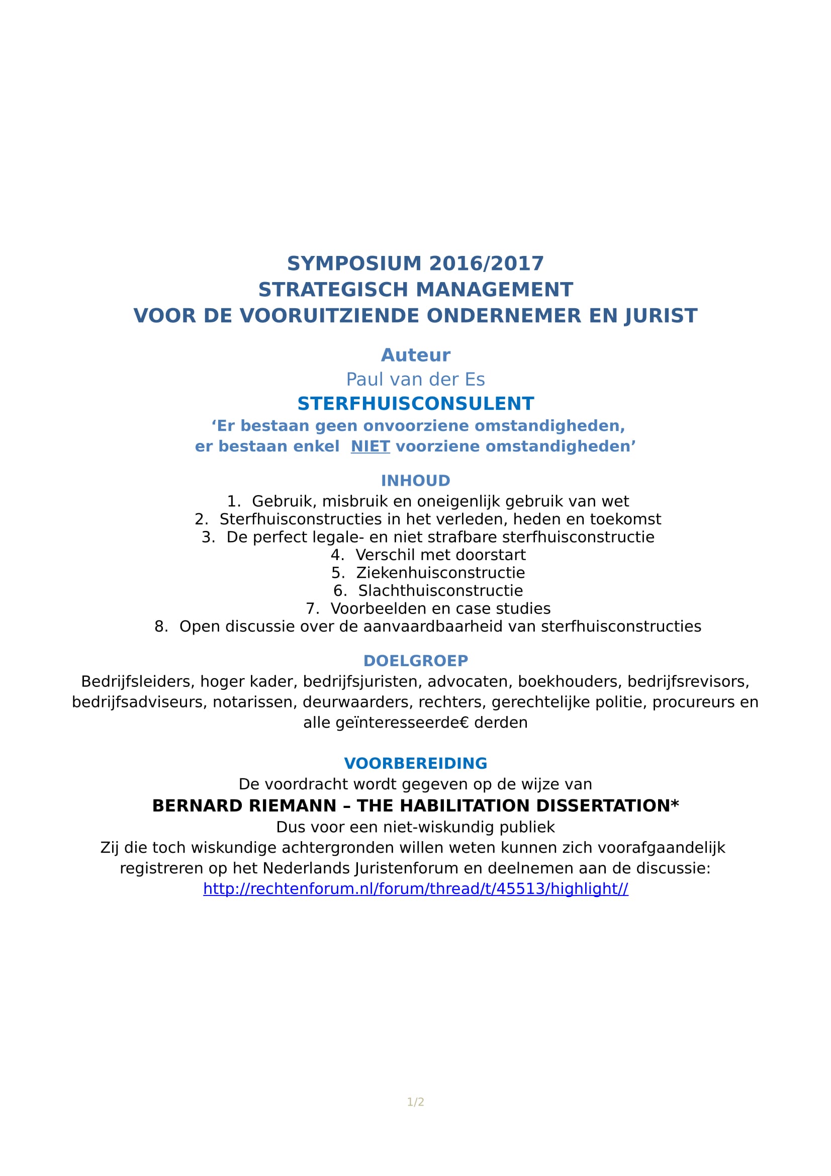 FUNCTIE : STERFHUISCONSULENT TAKEN: Sterfhuisconstructies begeleiden en te coördineren. Organiseren van brainstorm met management, aandeelhouders, borgstellers, boekhouder en/of bedrijfsrevisor. Wenselijk hierbij en aan te raden is dat een curator verbonden aan de betrokken rechtbank (arrondissement van de zetel van de vennootschap) als bijkomend adviseur bij de evaluatie fase wordt betrokken. Opstellen bijzonder verslag volgend op de alarmprocedure. BVBA: art. 332 – NV: art. 633. Maakt simulaties voor het financieel plan van de nieuwe onderneming. Maakt samen met de huisadvocaat alle documenten en notariële aktes. Is verantwoordelijk voor- en stelt de tegenbrieven op 1321 bw. Bepaalt samen met de huisadvocaat en boekhouder de datum van het uur 00:00. Pareert alle Pauliaanse- en aansprakelijkheidsvorderingen. Voert het woord ingeval van een strafrechtelijke klacht. Neemt de beslissing in de laatste fase van de brainstorm: stoppen of verder gaan. Voert de ISO 9001 en Balanced Score Card in(de nieuwe onderneming indien nuttig). Neemt deel aan de openingsvergadering en intakegesprekken (facultatief). Volgt alle rechtspraken en in zonder Cassatie inzake waarvoor een bijzondere kennis is vereist.(zie vereiste competenties) BEVOEGDHEDEN: Communiceren met schuldeisers. Criteria- en methoden bepalen ter beheersing van de sterfhuisconstructie. Samenwerken met externe partijen voor zaken met betrekking tot de sterfhuisconstructie. Vaststellen-, invoeren- en onderhouden van de sterfhuisconstructieprocessen. De vereiste dienstenspecifieke verificatie-, geldigverklaring-, bewakings- en aanvaardingscriteria voor de diensten bepalen. De documenten die de organisatie nodig heeft voor de sterfhuisconstructie ontwerpen en aanpassen. Individuele doelstellingen van de medewerkers wijzigen, zodanig dat ze bijdragen in het bereiken van de sterfhuisconstructie. CONTROLE : Waakt over het gans proces van de sterfhuisconstructie van het begin tot en met de opvolging. VERANTWOORDELIJKHEID: Vooral de juridische aansprakelijkheid ingeval hij niet legale sterfhuisconstructies en of slachthuisconstructies zou aanraden. Het welslagen op langere termijn van de nieuwe onderneming. VEREISTE COMPETENTIE : Kennis van abstracte wiskunde. Kennis van discriminant-, balans- en ratioanalyse. Bijzondere kennis in groeptheorie tot groepen van order 200. Kennis van Galoistheorie en extensieleer. Bijzondere kennis van axiomatisch denken en wiskundig bewijs. Kennis van vennootschaps- en handelswetten. Bijzondere kennis van beslagrecht. Kennis van faillissementswet. Bijzondere kennis van insolventierecht. Bijzondere kennis van vereffeningswet. Kennis van burgerlijk recht. Bijzondere kennis inzake overdracht- en verhuur van handelsgoederen en vorderingen, novatie, delegatie, subordinatie en subrogatie. Bijzondere kennis inzake bestuursverantwoordelijkheid en -aansprakelijkheid. Bijzondere kennis inzake Pauliaanse en zijdelingse vorderingen. Bijzondere kennis van pandwetgeving. Bijzondere kennis van borgwetgeving. Bijzondere kennis van intellectuele valsheid in geschriften. Kennis van het retentie recht. Bijzondere kennis van zekerheidsrechten. Bijzondere kennis van het handelsfonds (monografieën) en de wet op het pand handelsfonds. Bijzondere kennis van rechtspraak en rechtsleer inzake sterfhuisconstructies. Kennis van systeem ISO 9001. Algemene mensenkennis. Spreken in het openbaar. Goede organisator PLAATSVERVANGER Huisadvocaat. GEEFT LEIDING AAN Assistent sterfhuisconsulent. RAPPORTEERT AAN De opdrachtgever. http://forum.politics.be/showpost.ph...&postcount=207 http://forum.politics.be/showpost.ph...&postcount=244