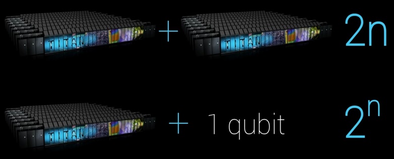 Om een supercomputer twee maal sneller te maken moet je 'm twee maal groter te maken. Formule = x n. Om een quantum computer twee maal sneller te maken moet je één qubit toevoegen. Formule = exponentiëel = tot de macht n. Uit: Can we make quantum technology work?