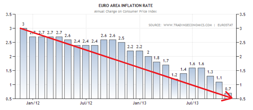 De komende jaren kan hierdoor de euro gaan dalen tegenover andere munten, in de eerste plaats de dollar. Lees meer hier.(fig.: inflatie eurozone)