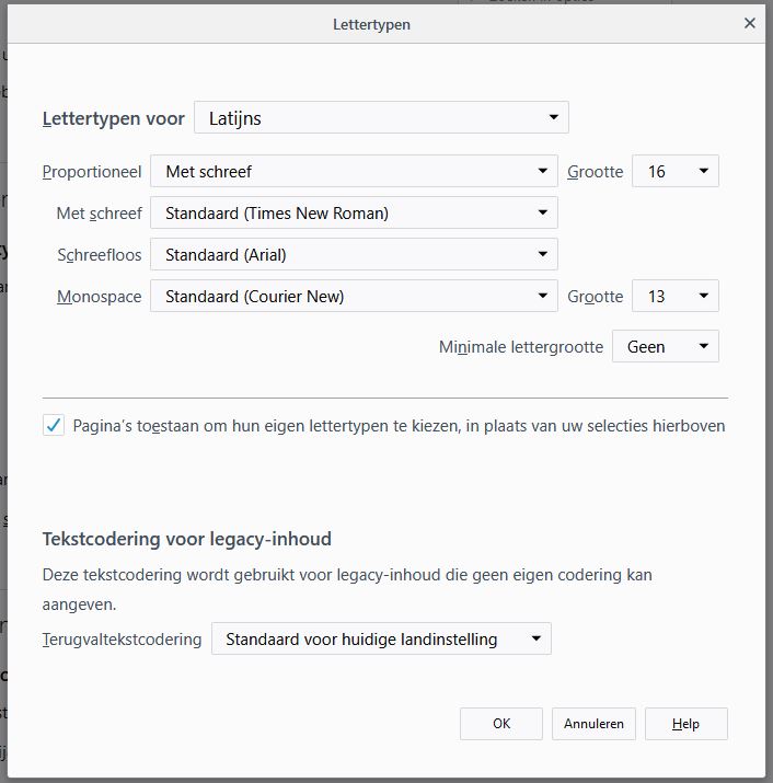 ![]() Lettertypes van websites kunnen in de browser "overruled" worden. Zie voor firefox. bijv. instellingen in bijlage.