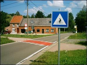 Blauwe borden zijn D-serie GEBODSBORDEN en die leggen de weggebruiker een verplichting op...dat zou elke weggebruiker toch tenminste moeten weten. Verplicht fietspad, G11, herkennen we aan een blauw, rond bord met een witte fiets. De F 50 is dan weer een vierkant, blauw bord met de fietser in zwart in een witte driehoek. F50 betekent de oversteekplaats voor fietsers en bestuurders van tweewielige bromfietsen. Zoals met alles bakt de politiek in dit apenland er helemaal niks van, verwarring zaaien en dan gaan ze ook nog wat knoeien met de verkeersregels zoals voorrang van rechts. Op rotondes heeft degene die reeds op de rotonde rijdt voorrang en geldt de voorrang van rechts NIET (meer!) maar velen weten dat niet waardoor er steevast ongelukken blijven gebeuren op rotondes! Bende corrupte knoeiers met een wildgroei aan verkeerborden om weer ene zijn zakken te kunnen vullen. Aan vele fietsoversteekplaatsen zie je HAAIETANDEN, dat betekent dat de fietser moet stoppen en geen voorrang heeft. Of kennen fietsers dat ook niet? Of gelden haaietanden enkel voor automobilisten?
