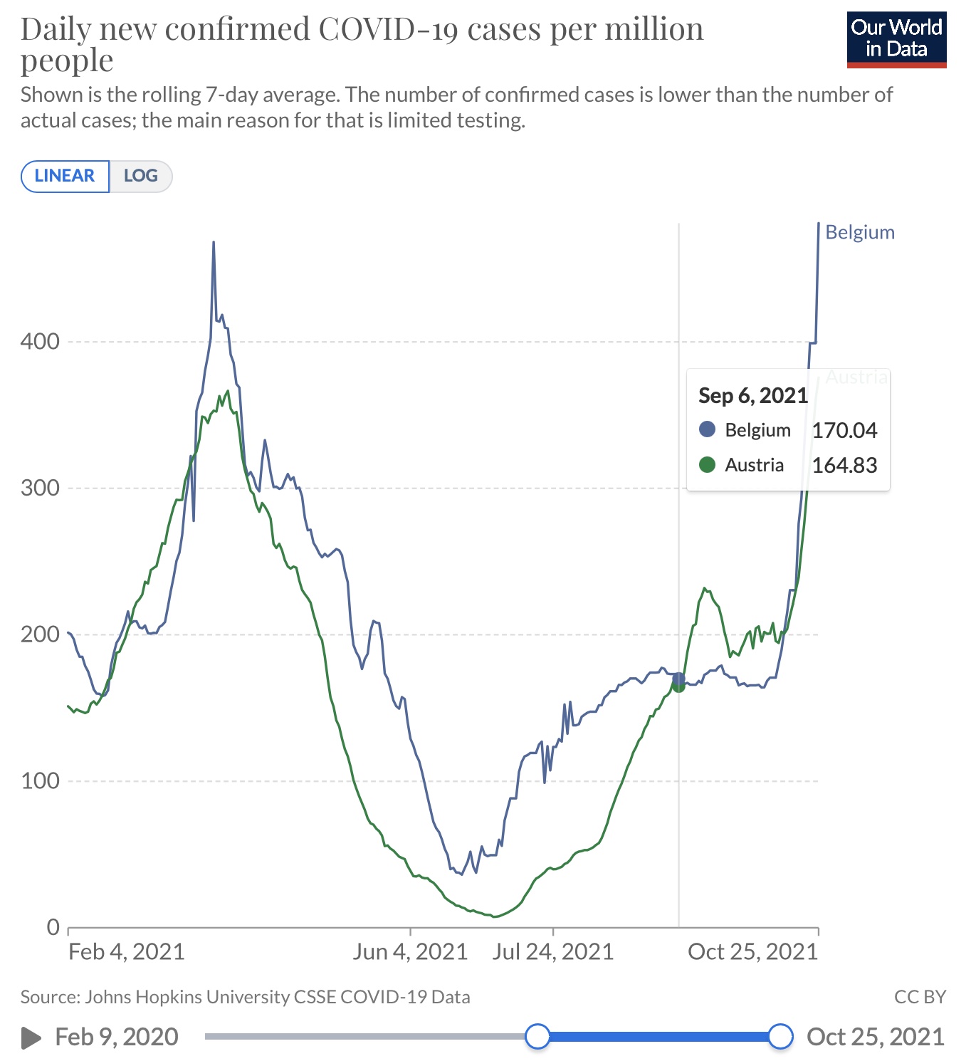 Ook de Denen zullen weer wat maatregelen opnieuw moeten invoeren, dat is voor elk land die met een exponentieel stijgend aantal gevallen zit quasi onvermijdelijk. |