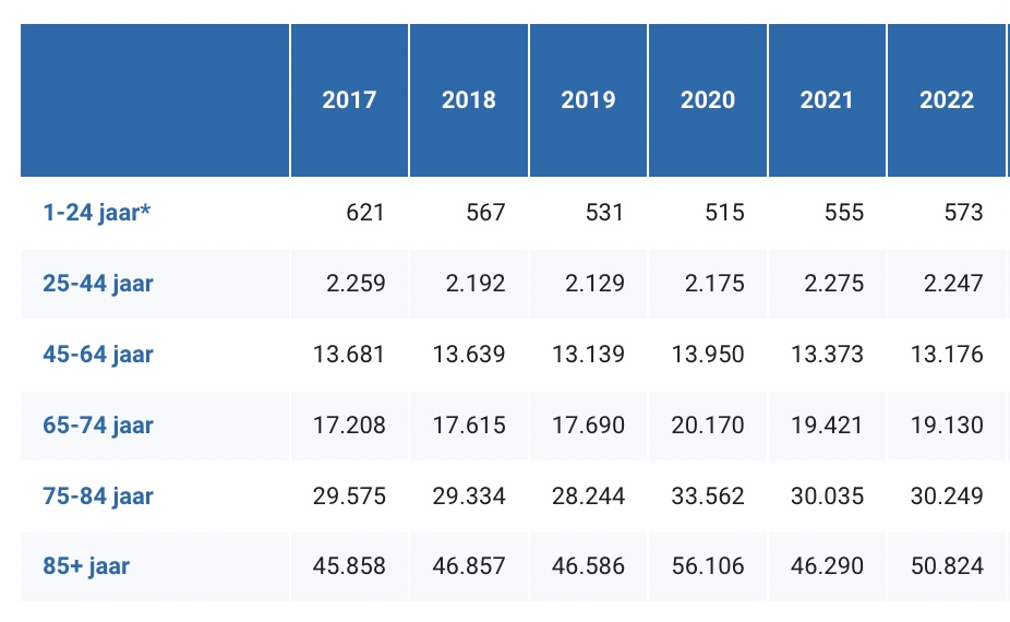 - tot 24 jaar stierven tot 100 mensen minder, dus bijna 20% ondersterfte in 2020 - van 25 tot 44 bleef het gelijk, 0% oversterfte - voor 45 tot 64 stierven 300 mensen meer, statistisch gezien is dit te laag om significant te zijn maar komt uit op 2% oversterfte in 2020. - van 65 tot 74 stierven 2500 mensen meer, ofte 14% oversterfte - van 75 tot 84 is het een 4000 mensen, ofte 12% oversterfte - Zoals verwacht stierven er 10.000 meer 85 plussers en die namen dus de grootste slag met 22% oversterfte. 1500 waren evenwel het gevolg van een hittegolf waarbij ventilators en airco verboden waren in rusthuizen. In totaal was er dus 16,6% oversterfte in 2020 Verontrustend in deze cijfers is dat hier ook overlijdens vanwege maatregelen zijn inbegrepen, de uitgestelde zorg, ziekenhuizen legen, zelfmoorden, hittegolf, enzovoort. Tot 65 jaar oud was covid dus letterlijks niets, nada. Maar toch was dit de groep die ze opsloten, werk afnamen, beboeten en in 2021 gedwongen inspoten met een experimenteel middel. En dat nadat ze de cijfers van 2020 al wisten maar opzettelijk niet meedeelden aan de bevolking die wel eens te slim zou kunnen worden. Wat we toen zagen was dus geen wetenschap maar waanzin. https://statbel.fgov.be/nl/nieuws/ov...-gestegen-2022 |