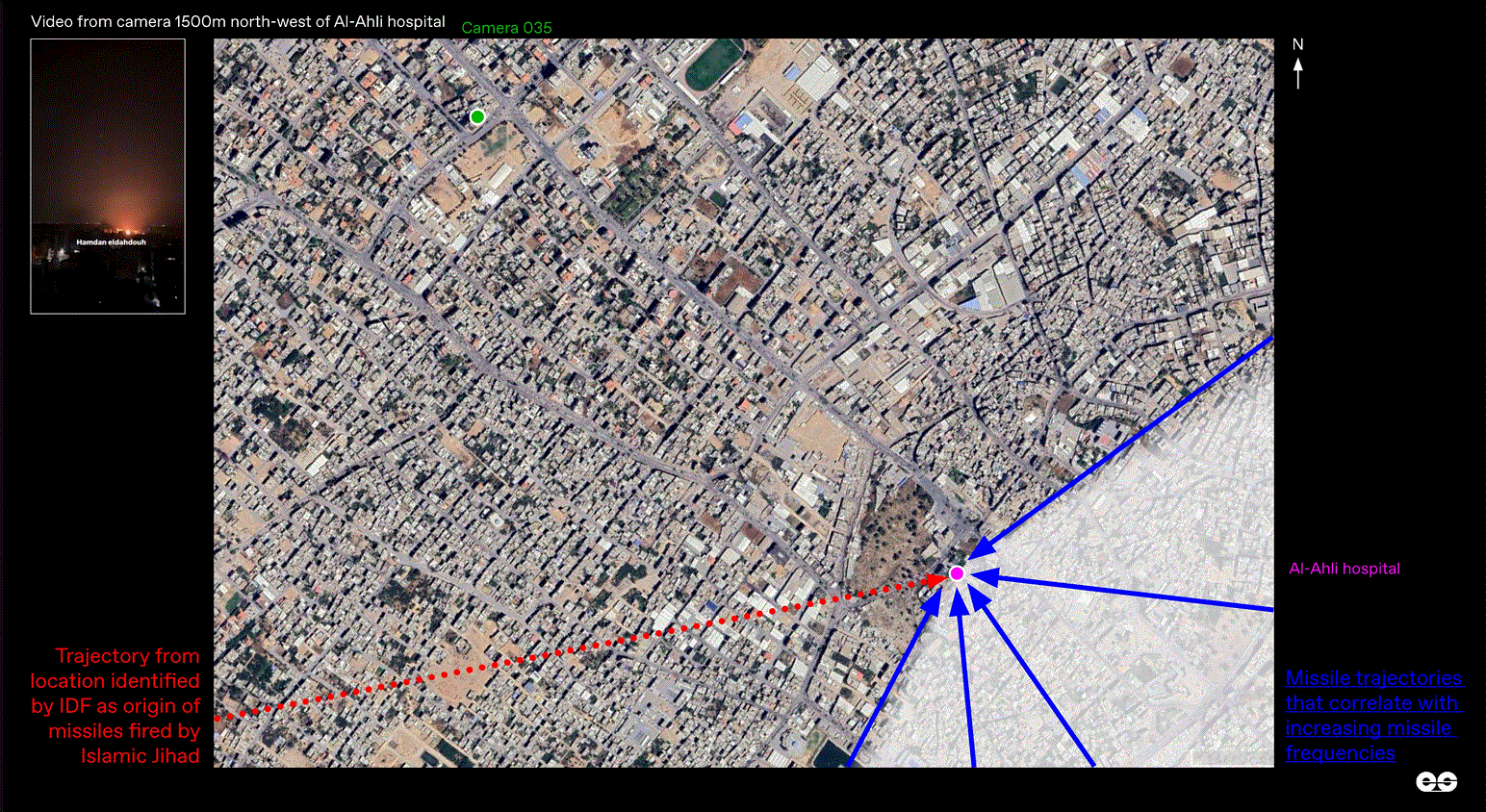 'misfired rocket' hit the Al-Ahli Baptist Hospital, using visual evidence to