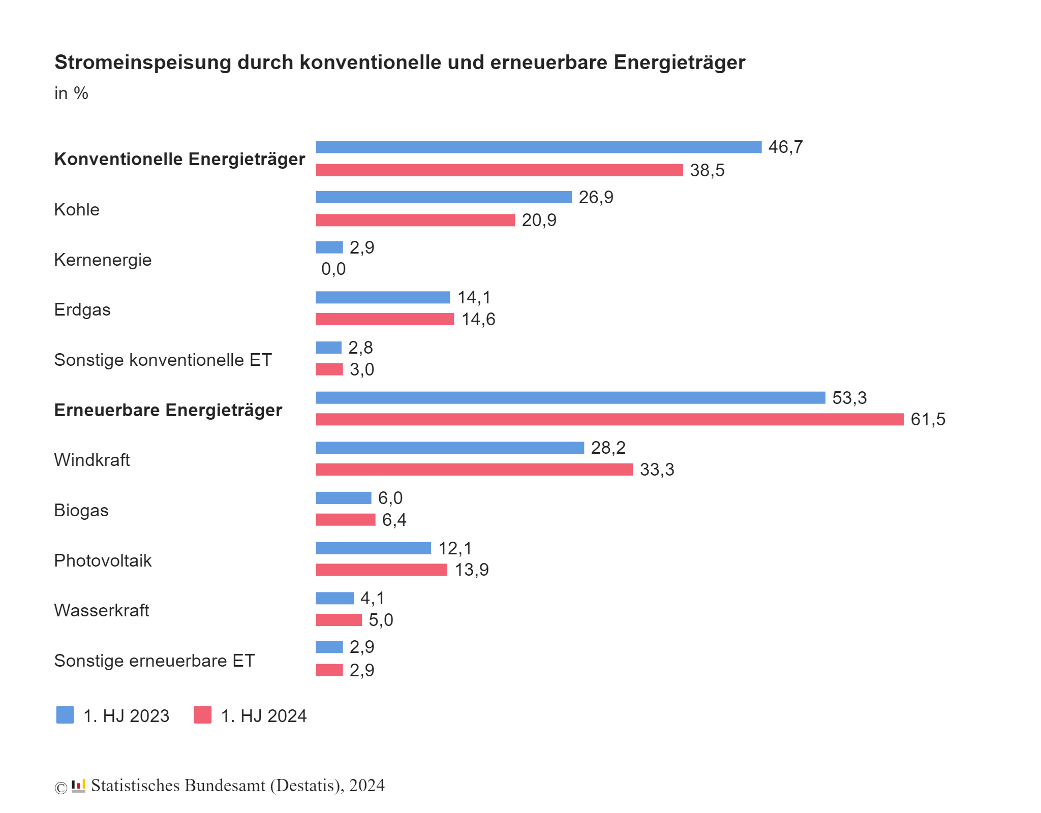 • Ik heb nu een persmededeling van Destatis (overheidsstatistiek) waar het nieuwe voorlopige cijfer 61,5% hernieuwbaar is, dit voor de eerste 6 maanden van 2024. De fossiele opwekking van electriciteit daalde significant , was nog 38,5 TWh. • Veel plezier met alle cijfertjes. Het is me gelukt de duidelijke grafiek te downloaden: de definitieve cijfers van H1 2023 (blauw) versus de voorlopige nieuwe cijfers van H1 2024 (rood). • Stel eens voor dat het vakje kernenergie 38,5 TWh aangaf ipv die 0 TWh. Dit zijn wel halfjaarcijfers, dus voor een heel jaar kan men het dubbele nemen. In elk geval was dat vakje kernenergie voor 2016 nog 85 TWh... (2e bijlage) De klassieke tabellen vind je onderaan als men de link opent, het eerste deel gaat via ggl-vertaler. Citaat: