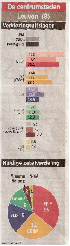 -sp.a gaat 4% vooruit en dat betekent dat ze nu op 35,1% staan -CD&V doen het ook goed, 5% vooruit, dat betekent 27,5%... zij zijn wel niet links. -VLD gaat 5% achteruit, dat betekent 13,5%, van VLD vind ik persoonlijk dat ze het niet verdienen om vooruit te gaan dus -Groen! gaat 1% achteruit dat betekent 12,8% maar ja we hadden niet anders verwacht, ik ben zelfs blij dat ze zo weinig achteruit gaan en nog steed (als de peilingen kloppen) meer zetels hebben dan het VB (groen: 5, VB: 2) -Vlaams belang gaan 1% vooruit en dat betekent 8,8% Besluit: Ik ben blij dat de linkse partijen het zo goed doen in Leuven en voor mij mag Tobback nog vele jaartjes burgemeester zijn! de spa en de cd&v hebben eenzeer goede samenwerking in Leuven, ookal is cd&v niet een van mijn favoriete, toch vind ik het zeer leuk in Leuven! |