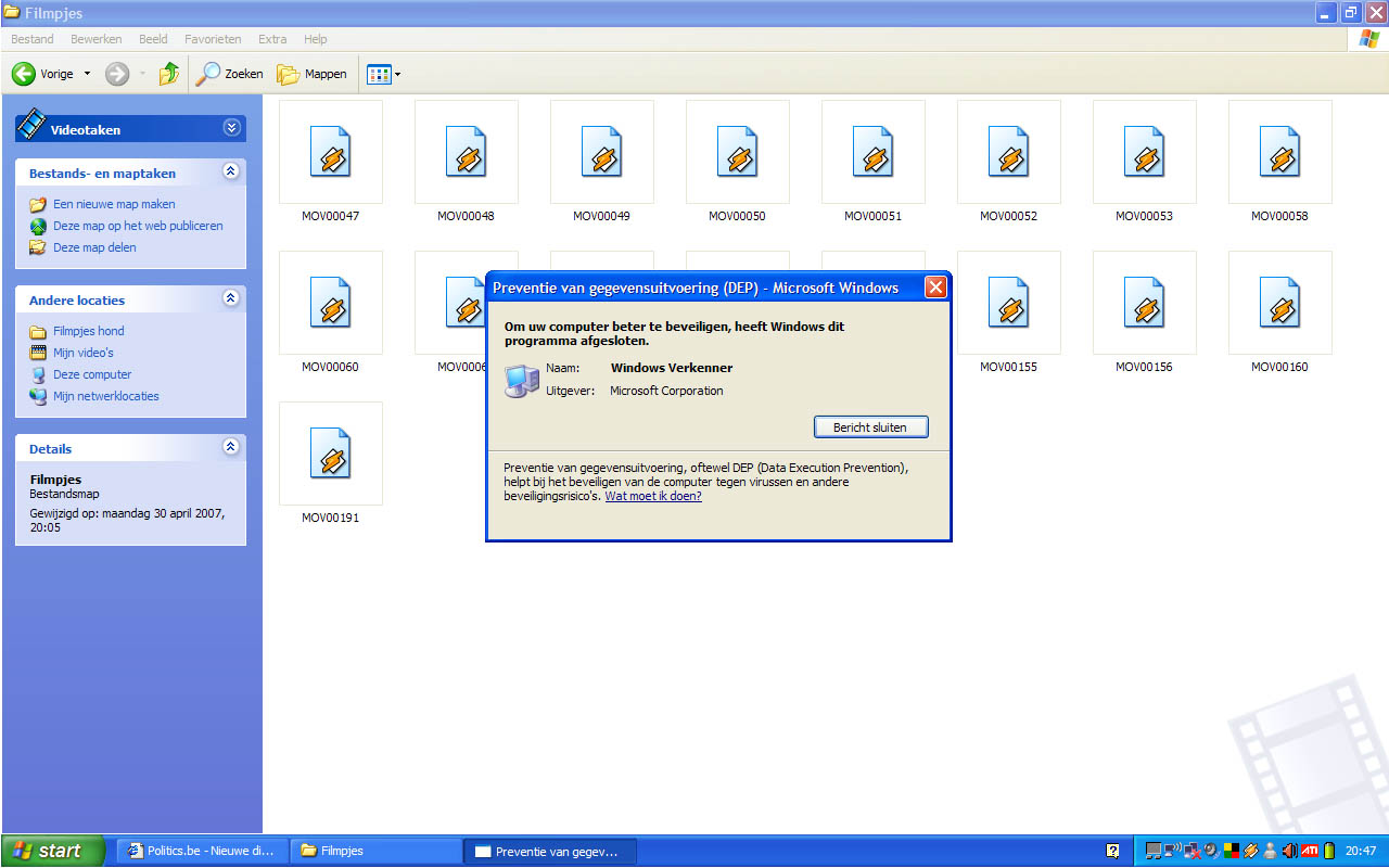 Pc heeft weer kuren, telkens ik in mijn verkenner opendoe en in de desbetreffende map een filmpje staat. Krijg ik het volgende... Hoe los ik dat op?