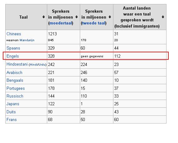 Ik denk dat twee dingen duidelijk zijn. Engels wordt gebruikt in het grootste aantal landen en dit aantal stijgt jaarlijks. Nederlands komt in de tabel niet voor. Als we vervolgens nog even de moeite doen om de analfabeten eruit te filteren dan zit het Engels nog veel steviger in het zadel. Merk nog even de positie van het Frans op....60 landen Laatst gewijzigd door Johan Daelemans : 17 januari 2014 om 15:36. |