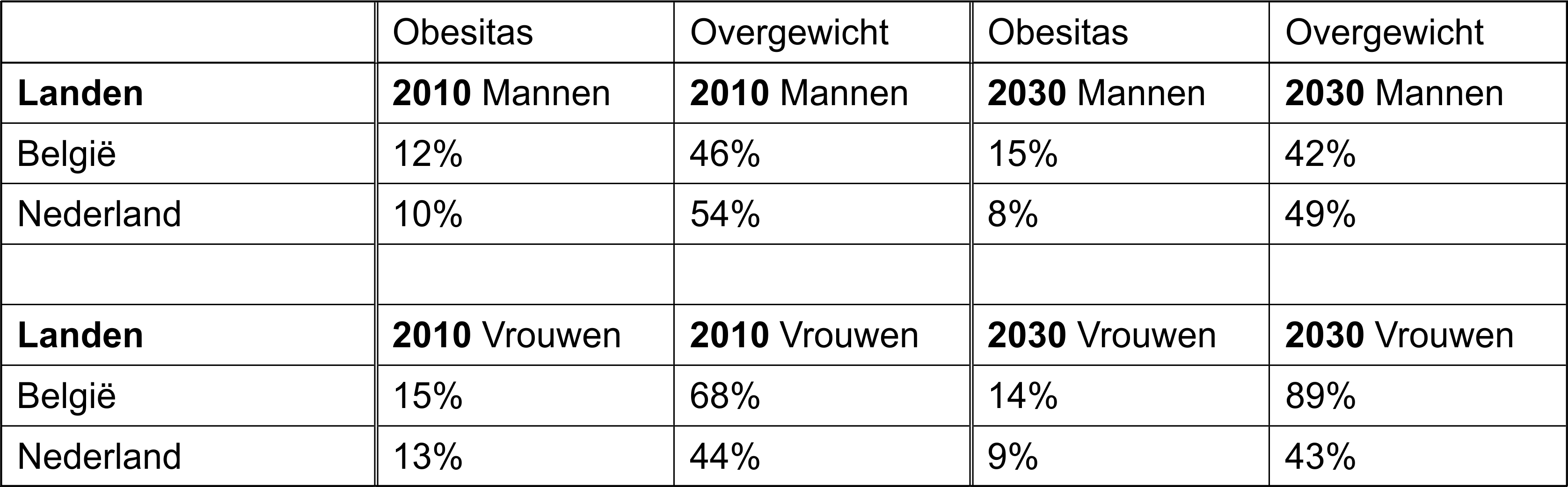 In onze beide landen daalt het overgewicht bij mannen. In Nederland daalt eveneens obesitas. In België slechts een zeer geringe stijging. Onbegrijpelijk waarom bij Belgische vrouwen totaal tegengestelde cijfers. Hier is de link. (De cijfers van deze link in tabellen geplaatst) http://nos.nl/op3/artikel/2034262-wa...an-europa.html |