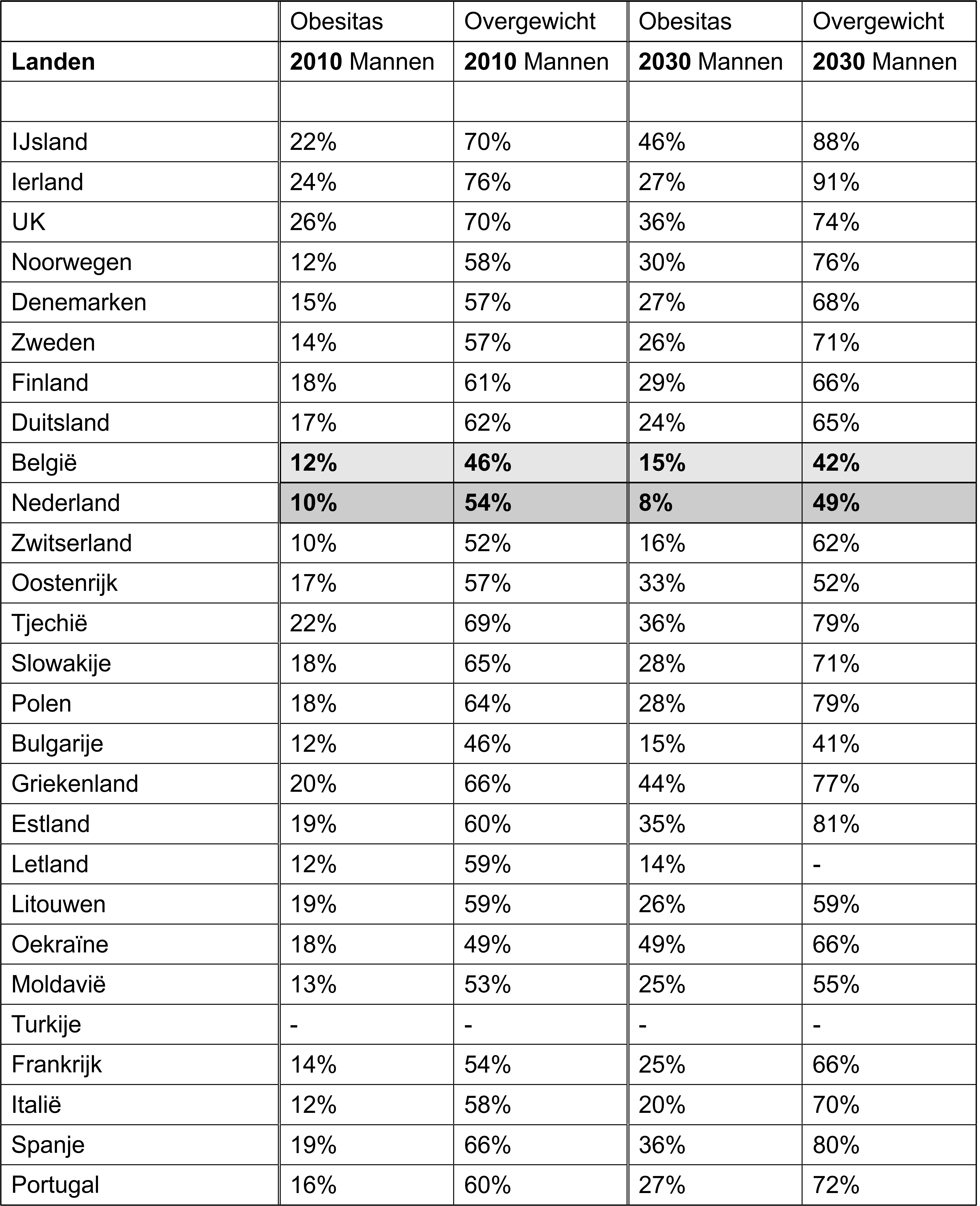 ![]() Tabel overgewicht, obesitas mannen - Europa