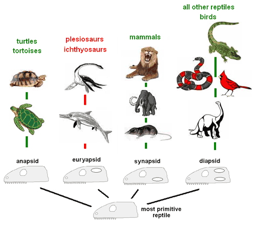 Krokodillen, vogels, dinosaurussen zitten in dezelfde tak. In dit geval hebben ze de soortverdeling gedaan via de openingen in de schedel. ![]() |