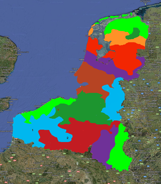 Drenthe, Groningen en Friesland bij elkaar steken lukt echt niet. Ik heb ze daarom tot 2 provincies gemaakt en Texel bij Friesland gevoegd om het numerieke verschil tussen Noord-Holland en Friesland wat gelijker te maken (al is het miniem) ![]() 1. Artesië 2. Henegouwen 3. Namen-Luik 4. Vlaanderen 5. Zuid-Brabant 6. Letzeburg 7. Limburg 8. Noord-Brabant 9. Zuid-Holland 10. Noord-Holland 11. Gelre 12. Friesland 13. Drenthe-Ommelanden |