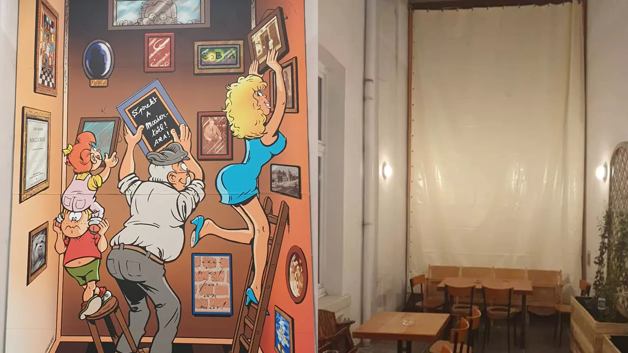 Stripmuur van Stam & Pilou in Brussels café Het Goudblommeke in Papier voortaan bedekt met zeil wegens "te seksistisch"
