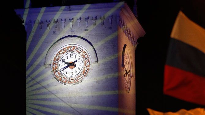 In de hoofdstad Simferopol woonden honderden mensen een ceremonie bij om de overheveling naar Moskoutijd te vieren. BRON