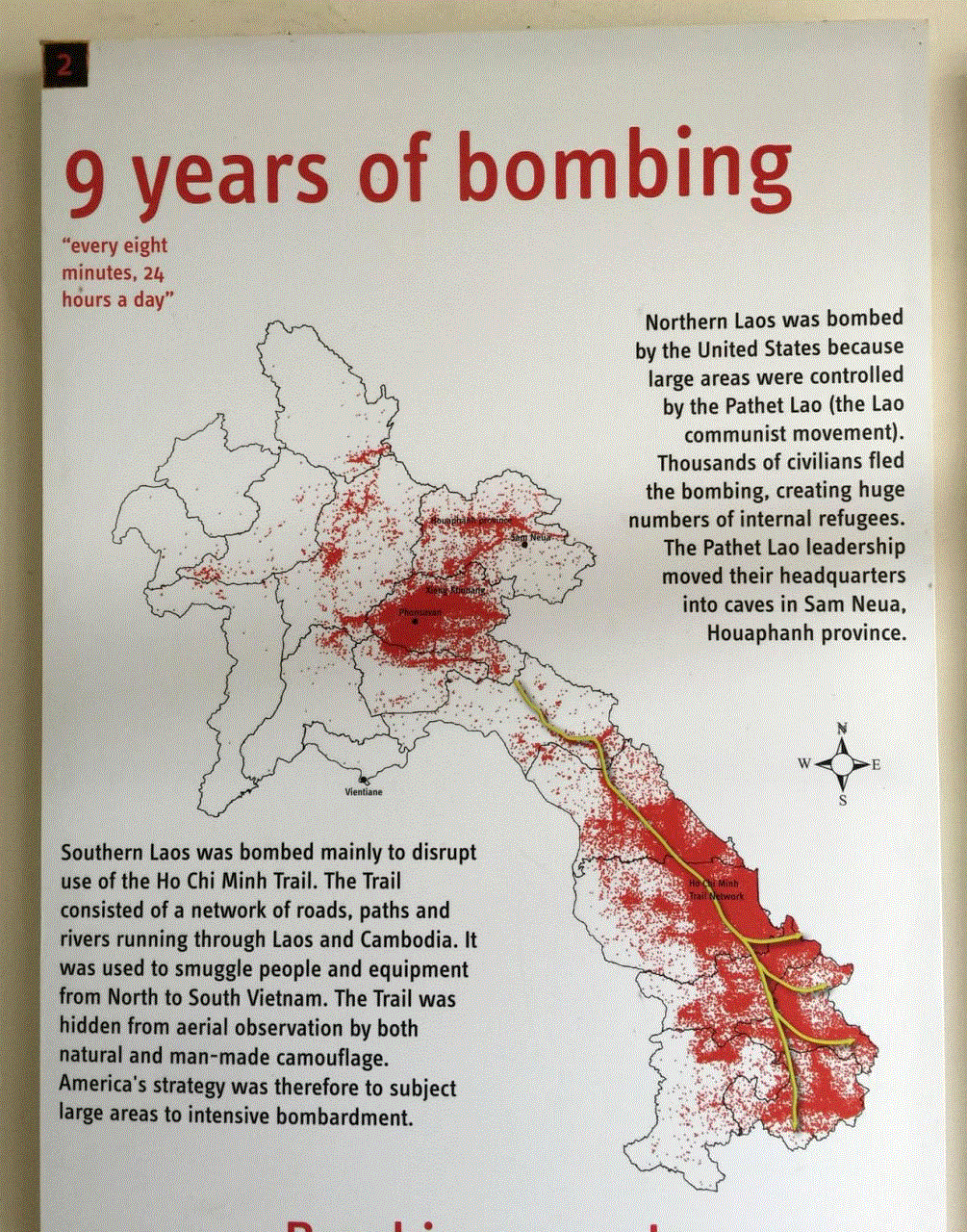 "Elke acht minuten, 24 uur per dag, negen jaar lang, van 1964 tot 1973, werd een vliegtuiglading clusterbommen op Laos gedropt door Amerikaanse B-52's." (fig.)