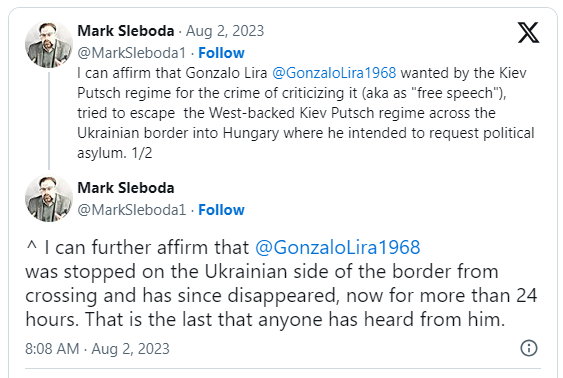Gonzalo Lira Was ‘Stopped On The Ukrainian Side of The Border From Crossing And Has Since Disappeared' LINK 2 aug 2023 (fig.)