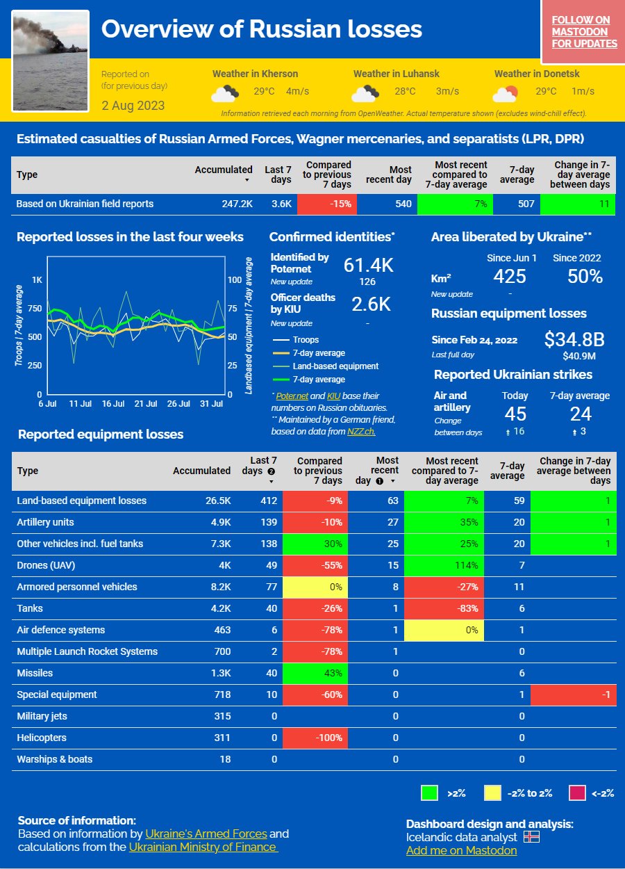 een rationele kijk naar de cijfers leert dat de verhouding 'materiaal RU-UKR' lichtjes beter wordt voor RU, wat niet betekent dat RU efficienter wordt, maar gewoon het natuurlijk gevolg is van gebrek aan materiaal van de russen ![]() ![]() ![]() ![]() groen betekent dat vooruitgang van Ukraine de laatste week is groter dan gemiddelde... er is dus met andere woorden een succesvol offensief