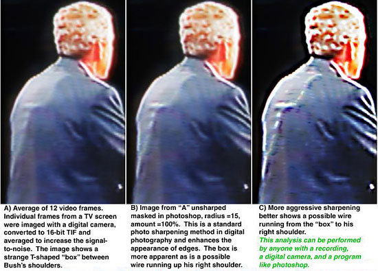 Zjorch hoeft helemaal niet slim te zijn.Hij hoeft enkel voor te lezen wat ze voor hem op papier zetten en na te zeggen wat ze hem vertellen.We weten allemaal dat hij gestuurd wordt,maar dat dat sturen veel directer gebeurt dan de massa vermoedt wordt simpelweg ontkend.Moeten we Zjorch op zijn woord geloven?Hem het vordeel van de twijfel geven?We hebben gezien waar dat heen leidt... In dit soort gevallen is een gouden regel vaak:als er twijfel over bestaat bestaat er eigenlijk geen twijfel over. Hier een filmpje van een halve minuut of zo van Bush die terwijl hij moet antwoorden op een vraag wacht op wat hij moet zeggen.Op wat hij wordt voorgezegd door iemand achter de schermen via een soort van earpiece (eerder een backpiece-misschien in combinatie met een earpiece). http://www.prisonplanet.com/video/bush_wired.mpg Hieronder drie foto's waarop het apparaat hetwelk op Bushs rug is bevestigd zichtbaar is en nog zichtbaarder wordt gemaakt door de foto's te "zuiveren". Bushs reactie wanneer hij in Good Morning America gevraagd wordt wat zich onder zijn jas bevond tijdens het PRESIDENTIEEL DEBAT:"I don't know what that is,I'm embarrassed to say it's a poorly tailored shirt." Ja hoor Zjorch... Bush's Secret of Debate;[edit] [size=1]Edit:[/size]