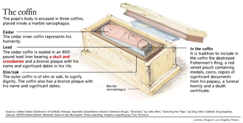 Vraag:"Is it true that the pope's body was placed in other caskets before it was placed in the crypt? I have heard that one is of wood and another is marked with a skull and cross bones. Why would skull and cross bones be used?" Antwoord :"Pope John Paul II's body was interred in three caskets. The triple caskets reflect longstanding tradition for the burial of popes. The innermost casket--the one in which his body lay during his funeral--was made of cypress wood. That casket was placed inside a second casket made of zinc (traditionally, lead was used), presumably to seal the body from the ravages of insects. The third, outermost casket was made of walnut wood (the traditional wood was elm). The second casket bears a skull and crossbones, along with John Paul's regnal dates." Slechts 1 kist wordt door het publiek aanschouwd en schijnbaar heeft een katholieke priester in de Matt Laurer Today Show gezegd dat er een S&B embleem op de middenste kist staat (als het effectief zo is-en meerdere bronnen beweren het-dan is het wederom en "heidens" symbool die in de RKK terug te vinden is). Hieronder een crucefix met S&B erop,een S&B uit een kerk en een afbeelding van de kist van JPII van de LA Times (zo zegt de bron)-let op de rode letters Skull and Bones. Laatst gewijzigd door Lex Blanca : 13 september 2006 om 07:31. |