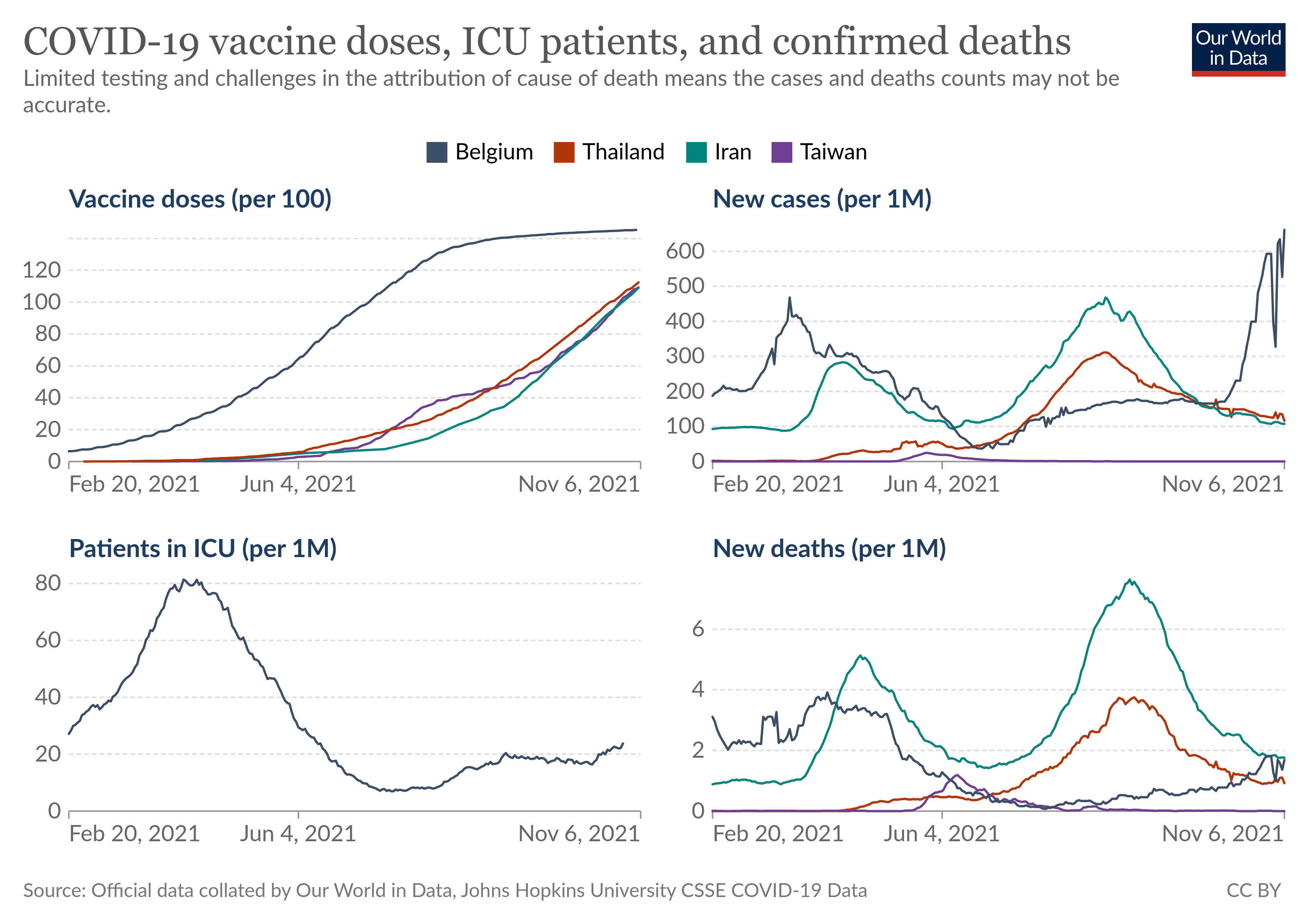 Ik ben een paar landen gaan opzoeken die nu het hardste aan het vaccineren zijn, en vergeleken met Belgie. Zoals we zien doet Belgie het met zijn veel hogere vaccinatie graad op dit ogenblik niet "veel beter" dan die landen met lagere vaccinatie graad maar met snelle vaccinatie nu. Maar merk ook het gigantische verschil op in verloop van de epidemie tussen die landen, met vergelijkbaar vaccinatie profiel. |