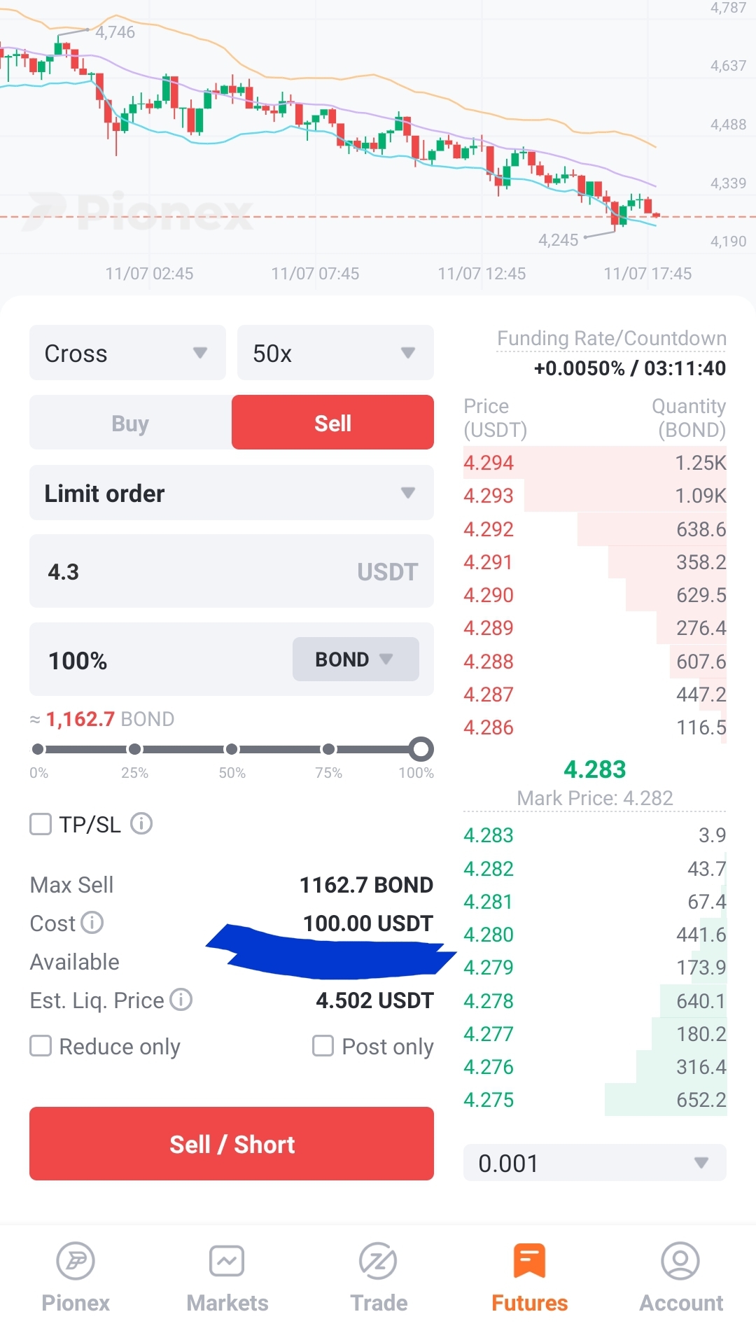 Zie, as die dan tegen de 4 dollar komt, dan laat ik die los (assem het order invult tenminste) en switch ik over naar buy. 2x100 dollar met een leverage van 50x.