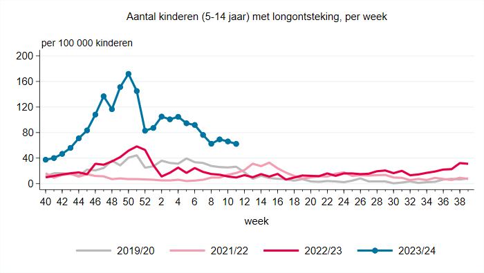 https://www.rtlnieuws.nl/nieuws/nede...nderen-cijfers Niet alleen kinkhoest gaat rond, ook het aantal kinderen met longontsteking neemt fors toe. Vorige week gingen 130 op elke 100.000 5- tot en met 14-jarigen met longontsteking naar een huisarts. Dat is meer dan twee keer zo veel als op het hoogste punt vorig jaar. Nivel noemt het 'opvallend veel'. |
