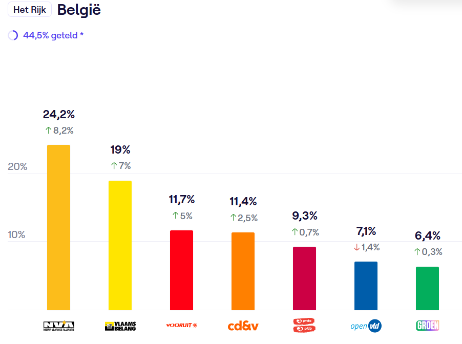 wtf, die tussentijdse uitslag is toch wel verrassend: nva houdt zeer zwaar stand. VB wint, maar niet zoveel als gedacht, vld en groen afgeslacht.