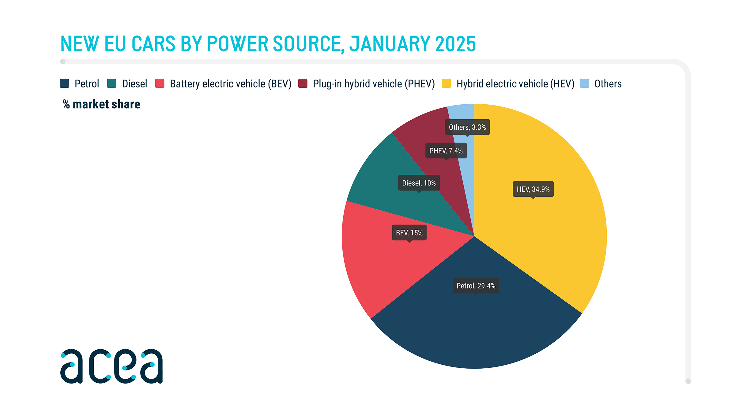 Reeds 33,8 % marktaandeel BEV in januari 2025. Cijfers via ACEA. België is reeds nu al een van de grote EV-stijgers in Europa geworden. Als *Tesla langzaamaan op volle productie loopt, en dat is reeds de laastste 2 weken te zien, kan het marktaandeel enkel nog wat extra stijgen. Citaat: