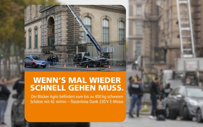 producent van lift gebruikt bij Louvreroof maakt reclame met beeld van die overval. ![]()