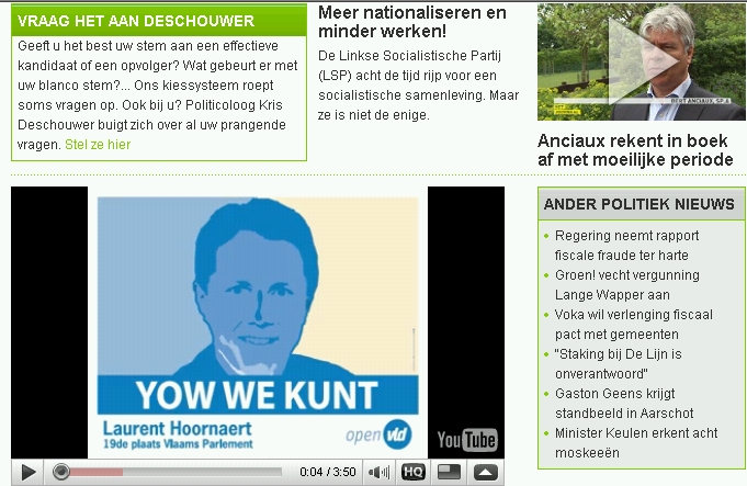 ![]() Als je naar het verkiezingsdeel van de Vrt surft, http://www.deredactie.be/cm/vrtnieuws/verkiezingen09 , wordt er openlijk reclame gemaakt voor een spa kandidaat via een youtube filmpje. Neutraliteit VRT?