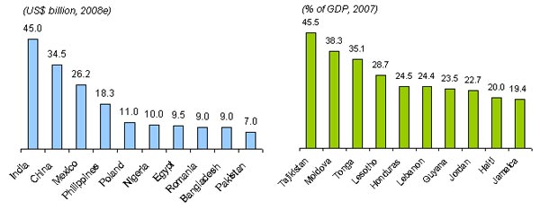 Remittances noemt men dat. Voor een aantal landen een heel belangrijke bron van inkomsten. Ook die geldstroom zal met de huidige crisis een serieuze knauw krijgen, vermoedelijk. Voor de tabellen van hieronder, zie: remittance-flows-to-developing-countries