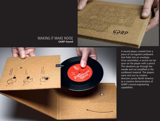 Created by audio engineering company GGRP Sound, this corrugated cardboard sleeve can be opened up and converted into a human-powered record player. The player allows you to turn the record via a pencil with detailed instructions printed on the sleeve itself. |