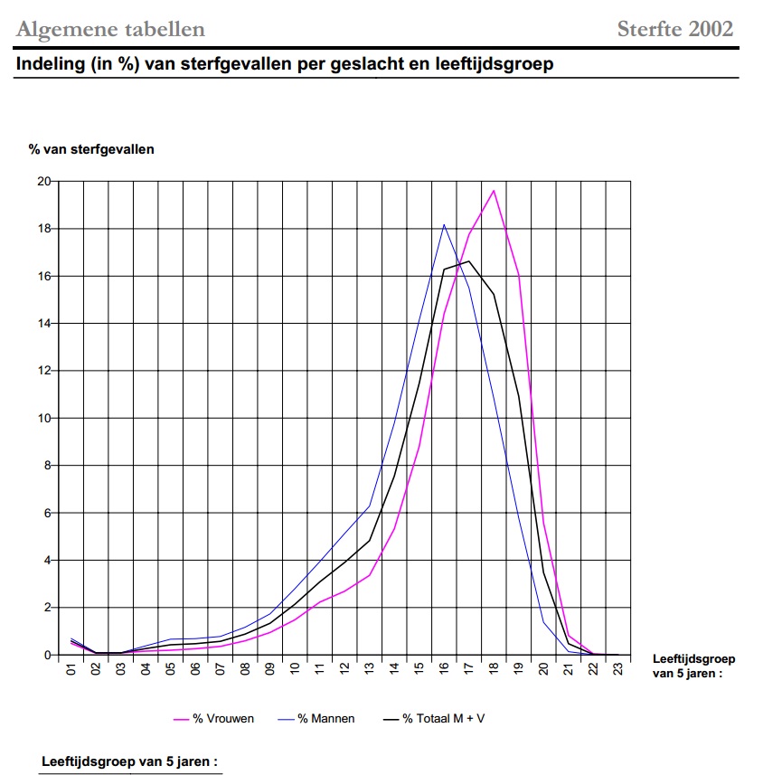 het is dus zo dat de mannen rond de 77 gemiddeld worden,e nde vrouwen mogen zeggen dat ze 87 worden. Daar ligt de piek voor beide geslachten zit er dus een verschil van 10 jaar