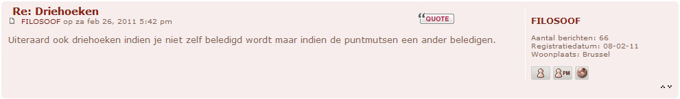 Ons morele immuunsysteem is na WOII zo ingesteld op zelfkritiek dat het externe virussen niet meer herkent, maar wel voortdurend de eigen cellen aanvalt. The paradox - The secret - The solution In België kan je gerust spreken van een multiculturele maffia Het sprookjesbos! Laatst gewijzigd door bf62 : 25 april 2012 om 09:29. |