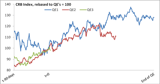 |   Ieder rondje QE daalt de waarde van de dollar en stijgen de prijzen van de grondstoffen. (fig.: grondstoffenindex)