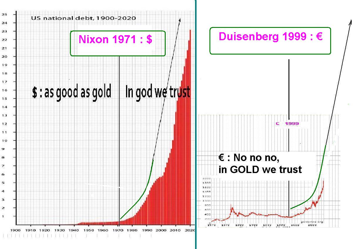 1. We can always print money : Amerika beslist in 1971 de goudstandaard te verlaten en drukt vanaf dan zoveel monopolygeld als zij dat willen.Kijk naar de exponentiële schuldopbouw vanaf 1971 !! Hiermee kopen ze de rijkdommen van de rest van de wereld op. http://www.youtube.com/watch?v=q6vi5...layer_embedded 2.Europa lanceert de € in 1999, als tegenzet tegen het $-financiële industrie-monster. Goud wordt aan marktwaarde gevalideerd door de € (ECB) op elk einde van het kwartaal. Een geniale tegenzet tov de $ (FED), die goud markeert aan 42$ op zijn balans. 3.Amerika reageert tegen de €-aanval op de $-hegemonie met een zelf aangedane atrociteit : 9/11 Hierdoor kunnen ze ongelimiteerd bases blijven installeren wereldwijd en proberen via militaire overmacht het Oosten te dwingen hun $ tegen olie te verkopen. Intussen verkopen landen als China, Rusland, India en Venezuela al hun olie voor fysiek goud. De US imperium loopt op zijn laatste benen. De Bricslanden gaan overnemen. De € zal modelstaan voor een nieuw monetair systeem, met goud in een hoofdrol. Laatst gewijzigd door Gambassi : 5 juli 2012 om 10:32. |