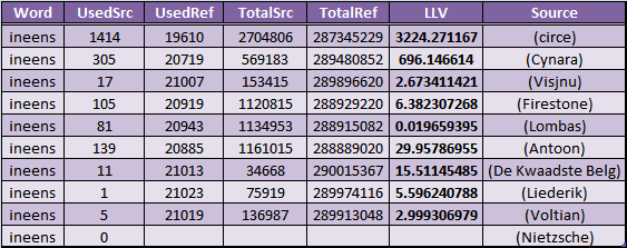 Idee: doe eens voor een groep van strings (pakweg 9) en zoek een verband voor LLV over een groep van strings tss verschillende forumleden. vb.: 1. denk 2. vind 3. is 4. feit 5. stelling 6. idee 7. belgië (misschien een probleem met het trema?...) 8. vlaanderen 9. europa