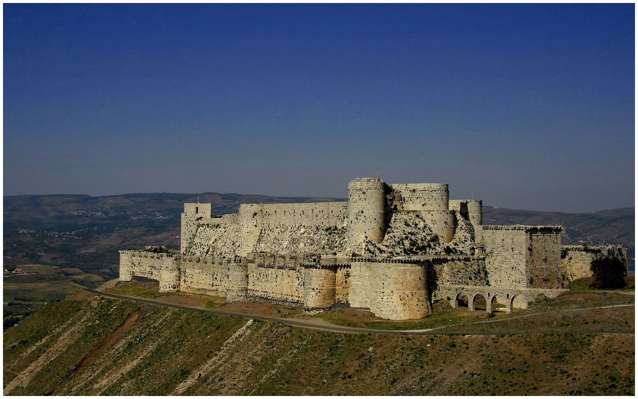 Krak des Chevaliers getroffen door rechtstreekse treffer (video)Hét kruisvaarderssymbool bij uitstek. Een eerste vesting op de plaats werd in 1031 opgericht voor de emir van Aleppo. De versterking werd tijdens de Eerste Kruistocht veroverd door Raymond IV van Toulouse, en in 1144 werd ze aan de Hospitaalridders gegeven. Deze orde herbouwde het tot een machtig kasteel, de grootste kruisvaardersburcht van het Midden-Oosten, met een binnengebouw en daaromheen een losstaande buitenmuur van drie meter dik, voorzien van zeven torens. In één van de torens woonde de Grootmeester van de Hospitaalridders, en in het kasteel was plaats voor een zestigtal volledig uitgeruste ridders en zo'n 2000 soldaten. In het binnenkasteel was een kapel, een ontvangsthal, een 120 meter lange opslagruimte en twee grote stallen, met ruimte voor 2000 paarden. De Krak was gereed in 1170, en is een voorbeeld geworden voor het ontwerp van vele burchten in Europa. BRON