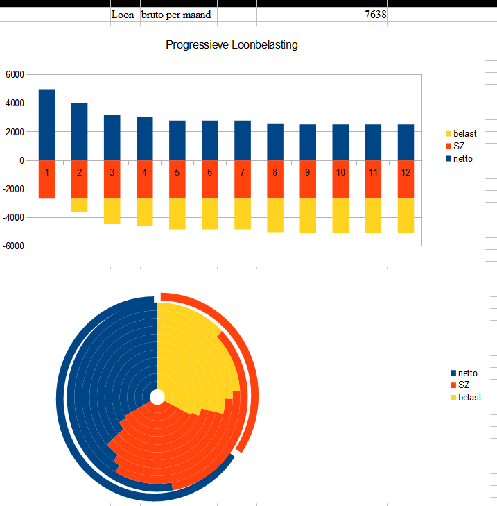 Netto Loon - belasting 0-40% - opcentiemen stad - provinciale lasten - sociale lasten 14% - sociale lasten voor depatron +34% Nog mooier systeem zou zijn, dat je in het begin van het jaar uw loon onbelast krijgt tot aan 10.000euro, en zo het effect van de schijven voelt. Dan betaal je zo de eerste 3 maand geen belasting, en begint vanaf april mei iedereen ineens te voelen dat hij 30% betaalt, en naar het einde van het jaar voel je zo uw loon krimpen naar 50% van wat je kreeg in januari. Zou echt wel die progressiviteit in beeld brengen voor de mensen. Het leuke zou zijn, in januari is uw loonbrief bvb 3000euro netto, en de taart toont 13% + 34% pf 1500 sociale lasten. Maar dan vanaf augustus moet je beginnen terug werken voor 1200netto, en krijg je zo taartjes met 1200 belasting + 400SZ +1100SZ dat de meeste zouden stoppen met werken volgens mij vanaf ze één loonbrief met 50% aanslag zien komen, de algemene reactie zou zijn, ik kan beter gaan doppen, dan heb ik meer. Daar ga ik niet voor gaan werken.
