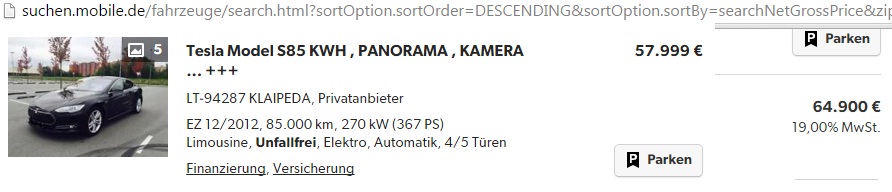Tesla toont vooral ook de vele zwaktes van de elektrische motor. - Geen motorgeluid - gevaarlijke 400 en nu zelfs 800 volt werkingsspanning (anders niet bruikbaar) - veel te duur - veel te zwaar (verplaats vooral zichzelf) - onbetaalbaar (alhoewel, zie inzet) - lange laadtijd - brandgevaar bij onderdompeling ( overstroming ) - kostprijs batterij - fragiel - top investering voor een consumenten wegwerpartikel. Nu, ik moet wel zeggen dat je een tweedehands Tesla Model S niet meer moet laten staan omdat hij te duur is. Geen 3 jaar oud en nog amper 60.000€ waard. Hoeveel koste die weeral nieuw? |