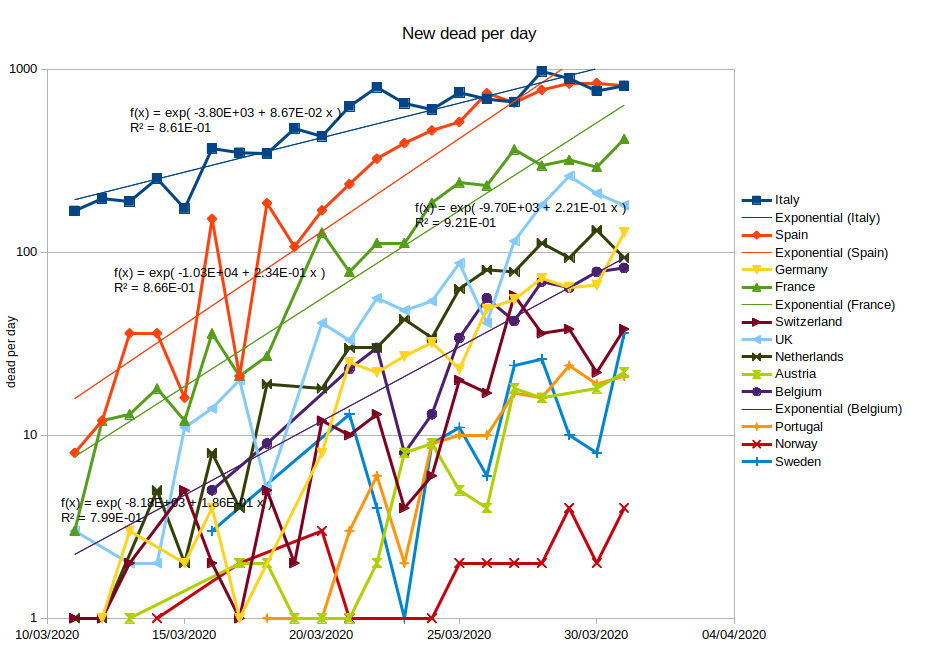 Het lijkt nu wel af te tekenen dat Europa (voornaamste bijdragen Spanje, Italie en Frankrijk) aan het afwijken is van haar initiele exponentiele groei. Maar we hebben nog een paar dagen nodig om daar uitsluitsel over te hebben... (cijfers van de WHO) |