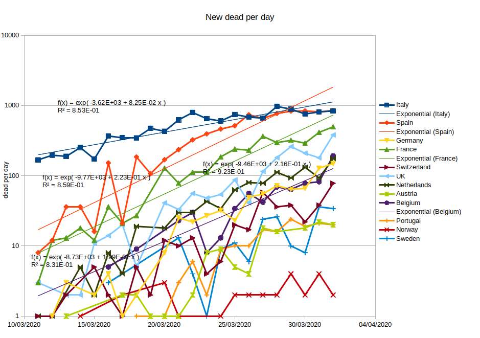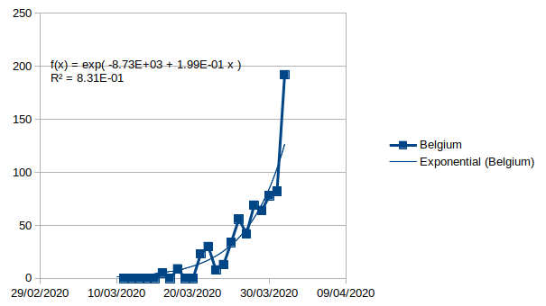 Zoals we zien, bevestigt het zich dat Europa zich van de initiele exponentiele groei is aan het afzetten. Er is nog steeds groei die mogelijks exponentieel is, maar met een tragere tijdsconstante. Dit komt voornamelijk omdat Spanje en Italie, de twee grootste bijdragers, aan het afvlakken zijn, en Frankrijk onduidelijke tekenen vertoont van misschien ook de initiele exponentiele groei wat te verlaten. Belgie zit anders mooi op zijn exponentiele groei evenals verschillende andere Europese landen, waaronder Duitsland bijvoorbeeld. De wereld groeit ook mooi exponentieel (de initiele offset door de Chinezen kan nu verwaarloosd worden). |