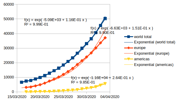 Zie post #1142 voor de laatste. De wereld tijdsconstante is 1/0.116 = 8.62 dagen. Dat is een verdubbeling om de 6 dagen. Belgie zit op een exponentieel met tijdsconstante 1/.195 = 5.1 Dat is een verdubbeling om de 3.55 dagen. Laatst gewijzigd door patrickve : 4 april 2020 om 20:04. |