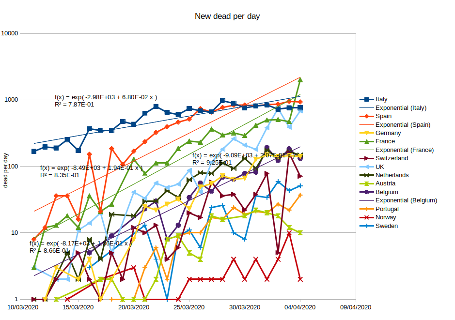 Wreed geambeteerd. Frankrijk heeft zijn telling voor het aantal doden aangepast, en rekent nu ook de doden van bejaardenhuizen mee. Dat geeft een enorme klopper van 2000 doden erbij, en hierdoor zijn al mijn statistieken naar de kloten die dat bevatten. Verder: Italie en Spanje zijn nu duidelijk aan het stabiliseren. We zien nog geen inzetten van een daling, maar dat zou logisch gezien voor volgende week moeten zijn. Frankrijk kunnen we niks van zeggen, met die veranderde getallen. Belgie zou wel eens kunnen beginnen plafonneren, maar dat zit helemaal nog in de statistische ruis, en kan evengoed nog exponentieel bezig zijn. Duitsland ook. Nederland ook. Kunnen we niet veel van zeggen voor 't ogenblik. De UK is nog mooi exponentieel. Zweden ook. Zwitserland ook. Europa in zijn geheel lijkt weer aan te knopen met een exponentiele groei, maar dat komt waarschijnlijk van die stoot van Frankrijk. De Amerikanen gaan aan een ongelofelijk snel exponentieel tempo. Een tijdsconstante van 1/0.26 = 3.83 dagen, wat neerkomt op een verdubbelingstijd van... 2.6 dagen !! Waaw. Op een week doen die maal 8 ! Laatst gewijzigd door patrickve : 5 april 2020 om 15:33. |